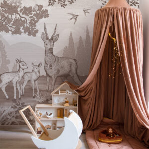 Influencer en twin mom Kelly Beukers koos voor het bosdieren beren behang in haar babykamer. Welk behang past bij jouw kamer?