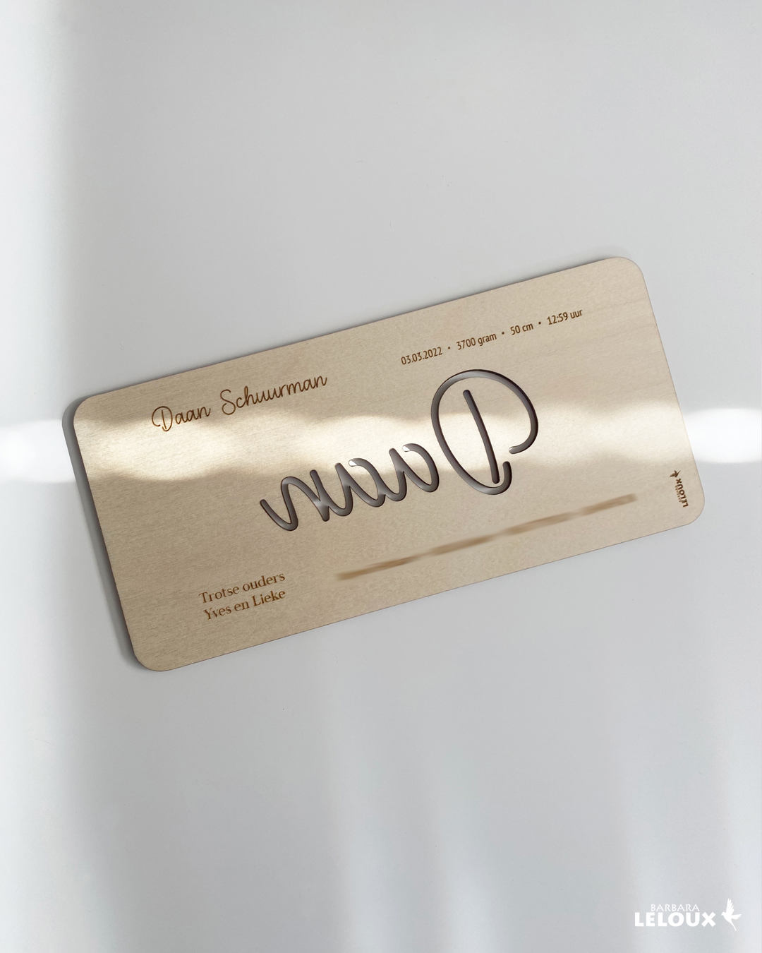 Een geboortekaartje van hout is een bijzondere manier om jullie baby aan te kondigen! Het berkenhout zorgt voor een mooi uniek en stoer kaartje. Het hout is een echt natuurproduct. Elk kaartje zal er dan ook uniek uitzien! De naam van jullie baby wordt uit hout gesneden.ย Hoe origineel is dat?