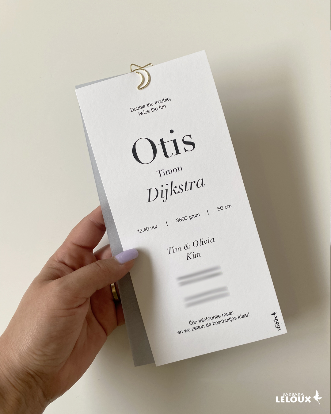 Dit originele geboortekaartje onderscheidt zich echt van rest. De afwerking met de gouden letters en het semi transparante papierย zorgen samen bij de voor- en achterkant van de kaart voor de finishing touch. Ben je ook opzoek naar een origineel kaartje? Dan ben je bij Barbara bij het goede adres! Samen komen we tot een ontwerp dat helemaal bij jullie past!