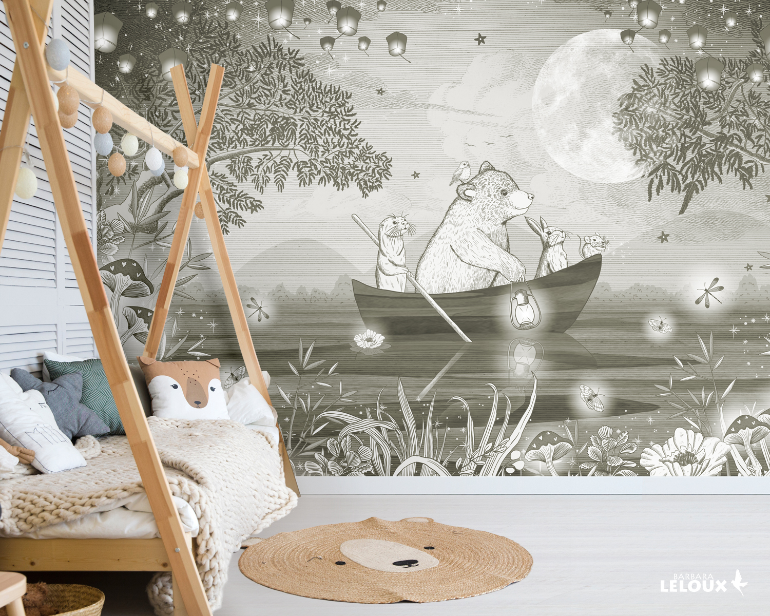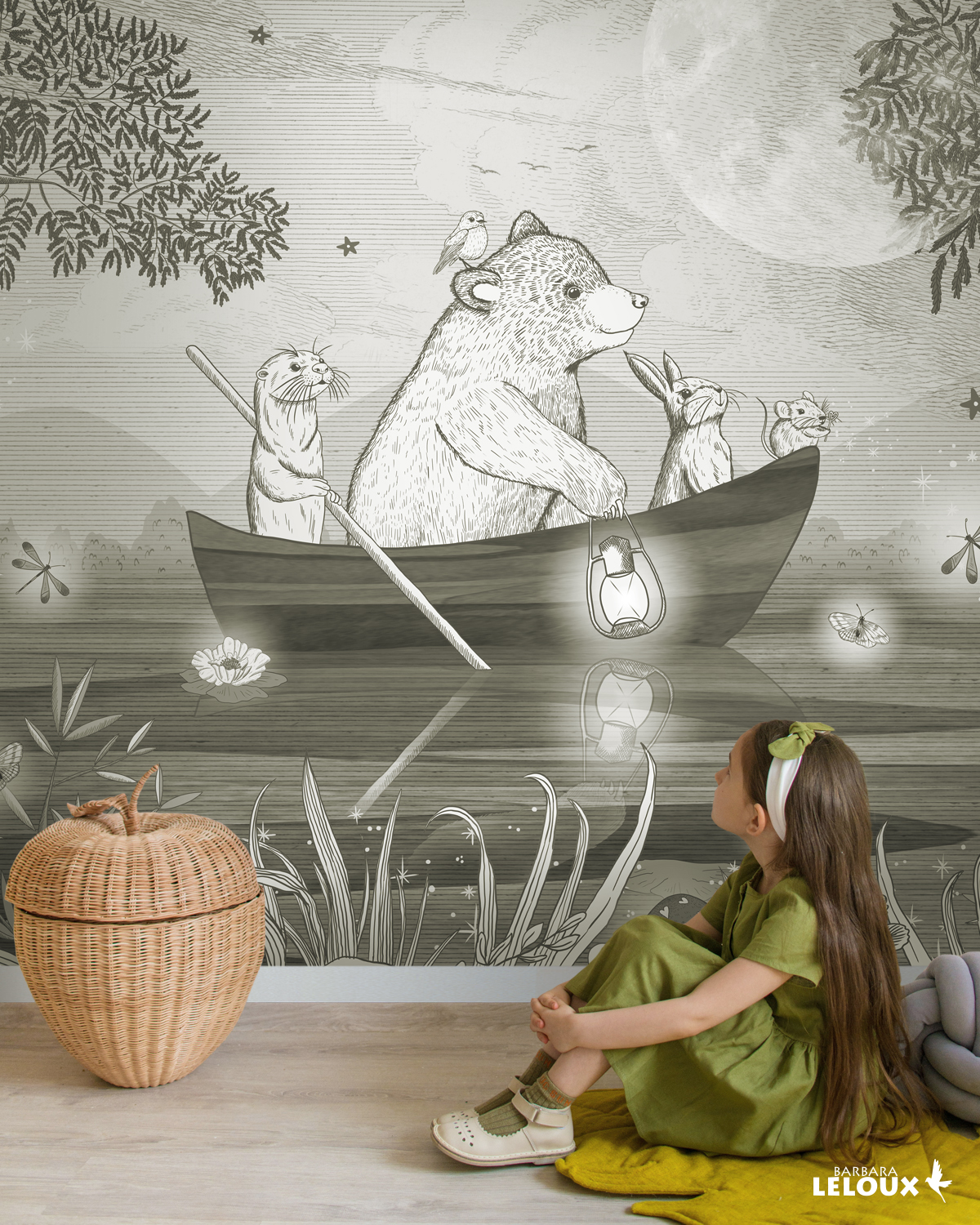 Maak van de baby of kinderkamer een magische plek. Dit unieke kinderbehang neemt je kleintje mee op een fantasierijke reis in een bootje, samen met een beer, otter, konijn, vogel en muis.